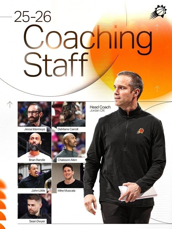 8月13日最新消息,菲尼克斯太阳队正式揭晓了2025-26赛季完整的教练团队阵容: